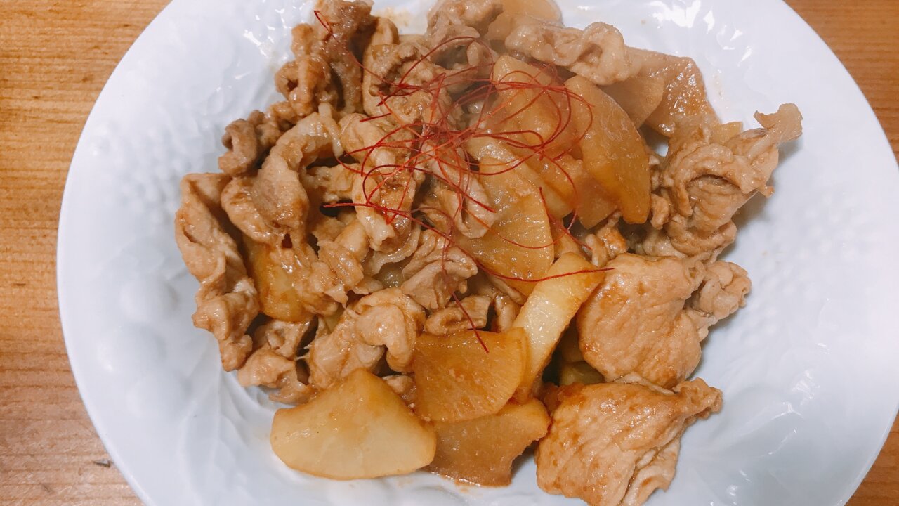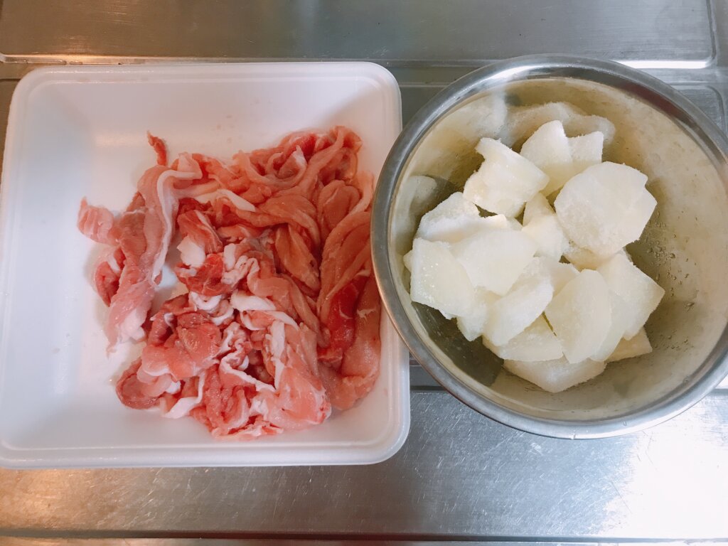 - フライパンにサラダ油少しひいて豚こまと大根、火を通す