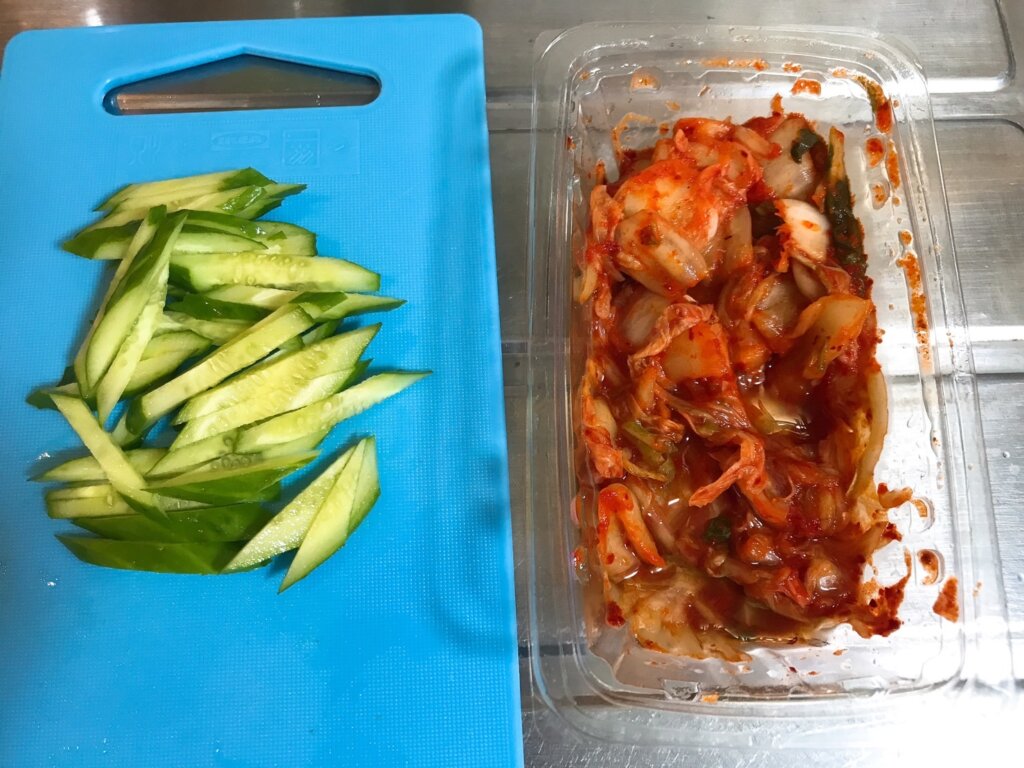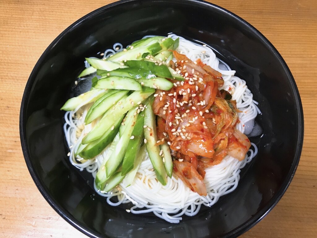 - ③にそうめん入れて、きゅうりとキムチをのせる