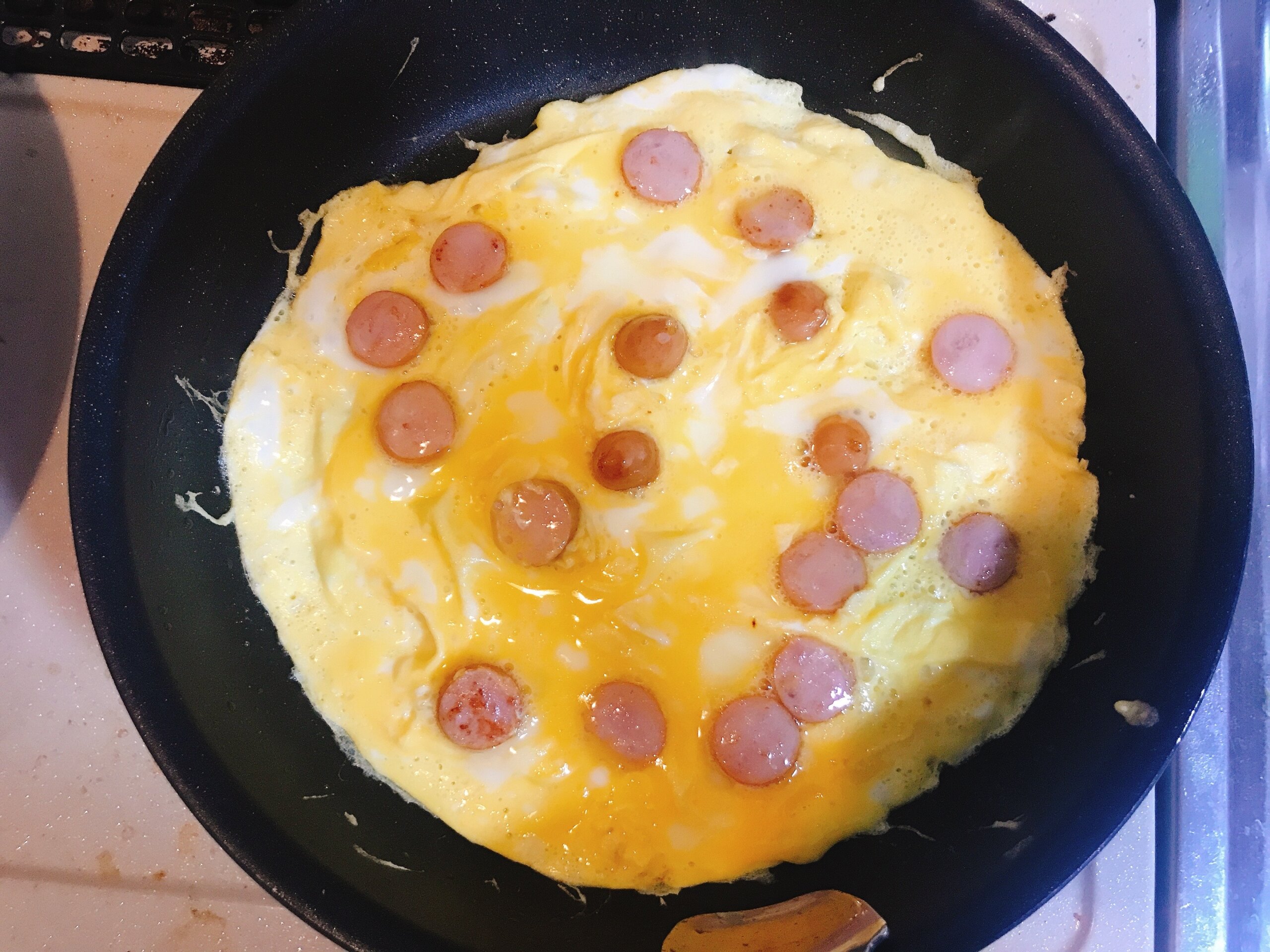 3. フライパンに油をひき、卵とウインナーを入れて焼く。このときに卵はフライパン全体に広がるようにする