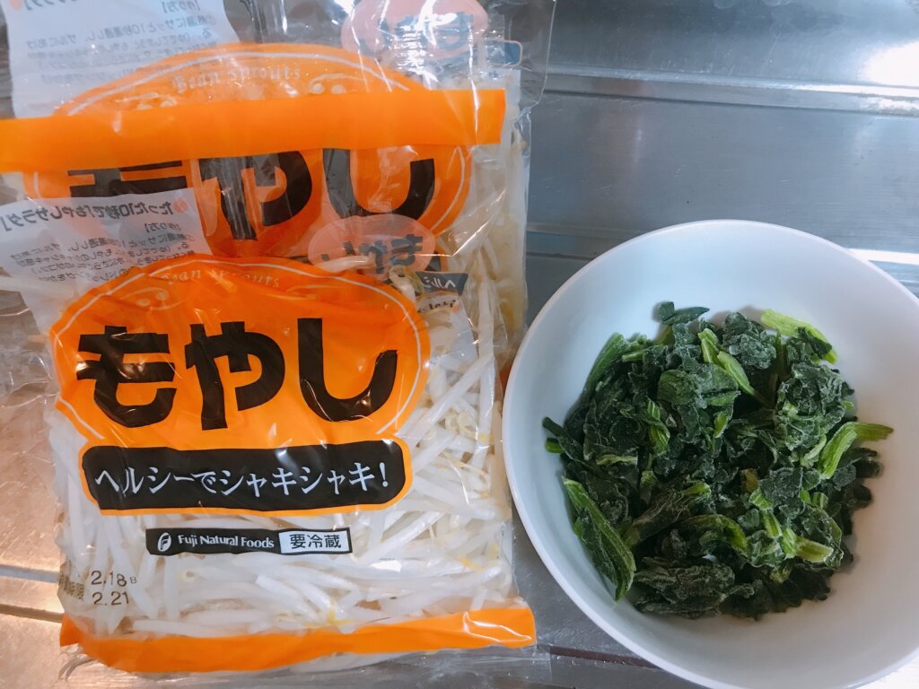 - 茹でたもやしと解凍したほうれん草を混ぜる