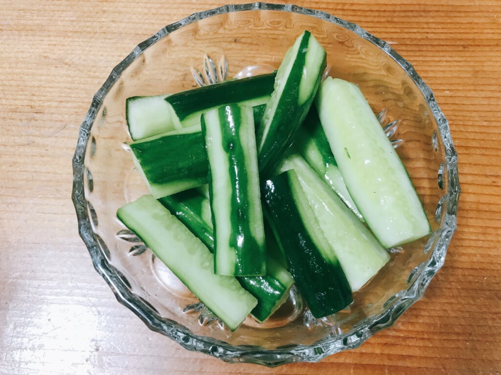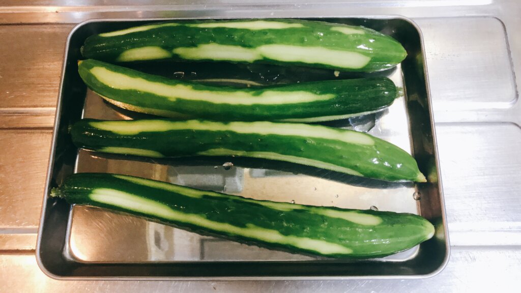 - きゅうりの皮をピーラーでむく(ストライプ)