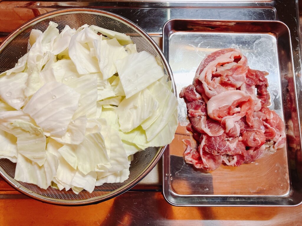 4. キャベツ投入。豚肉に火が通り、キャベツがしんなりするまで炒める