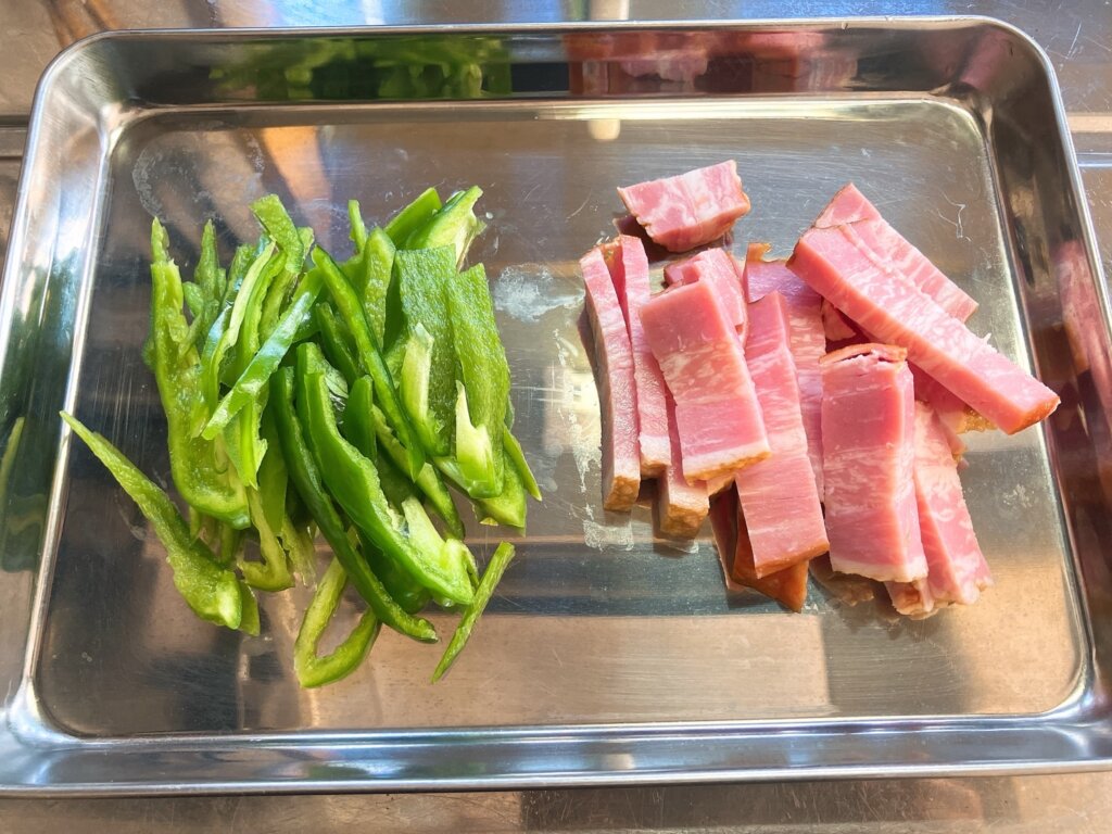 2. 茹でてる間にフライパンに油をひきベーコンとピーマンを焼く